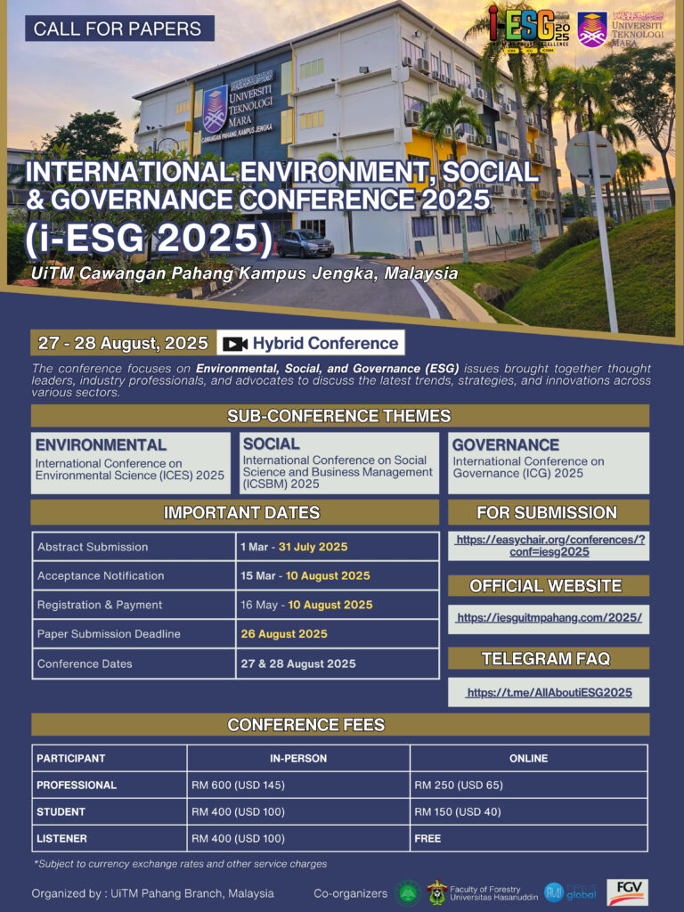 We are pleased to extend an invitation to you to participate in our upcoming event, the International Environment, Social and Governance Conference (i-ESG), which will be held from 27 & 28 August 2025 at UiTM Pahang Branch, Pahang, Malaysia. The three-day event will be conducted in a hybrid mode of presentation which comprises both in-person and virtual sessions. This will be a great platform for all researchers throughout the world to share their knowledge and expertise related to the ESG theme.